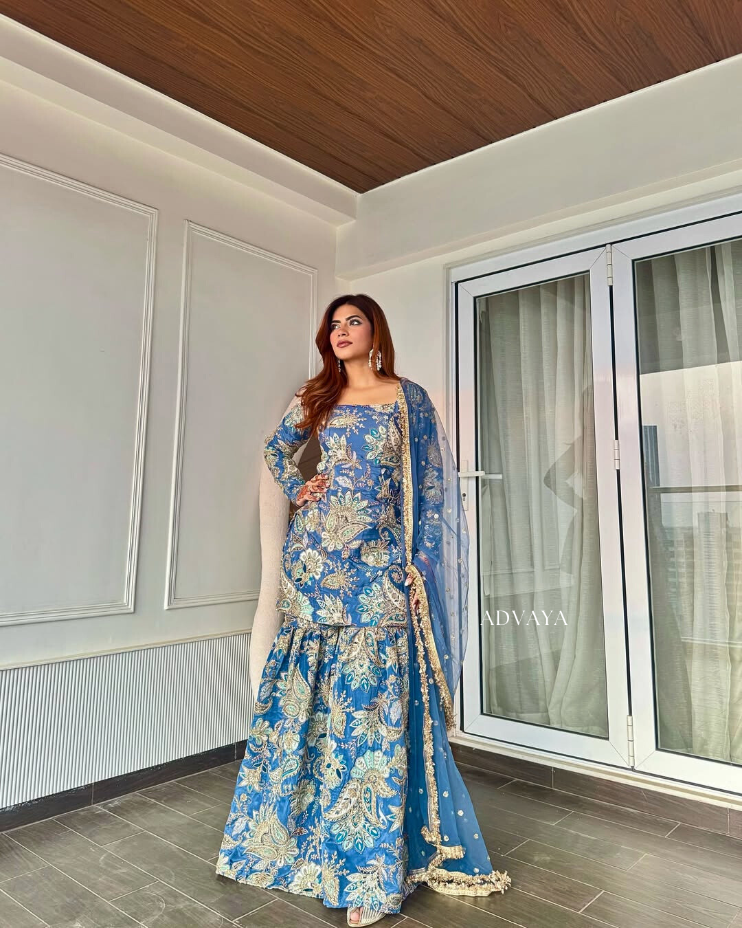 The SAMARA Heavy Silk Embroidered Sharara Suit Set redefines elegance with its rich Crepe silk fabric and detailed Handwork embroidery